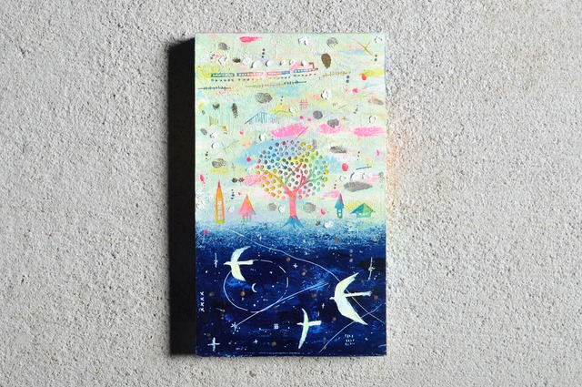 size:M3 (約237×160×19mm) 使用画材:木製パネル、アクリルガッシュ、クレパス ※額装なし ※展示場所の光によって本体の色が変わって見えます。 予めご了承ください。