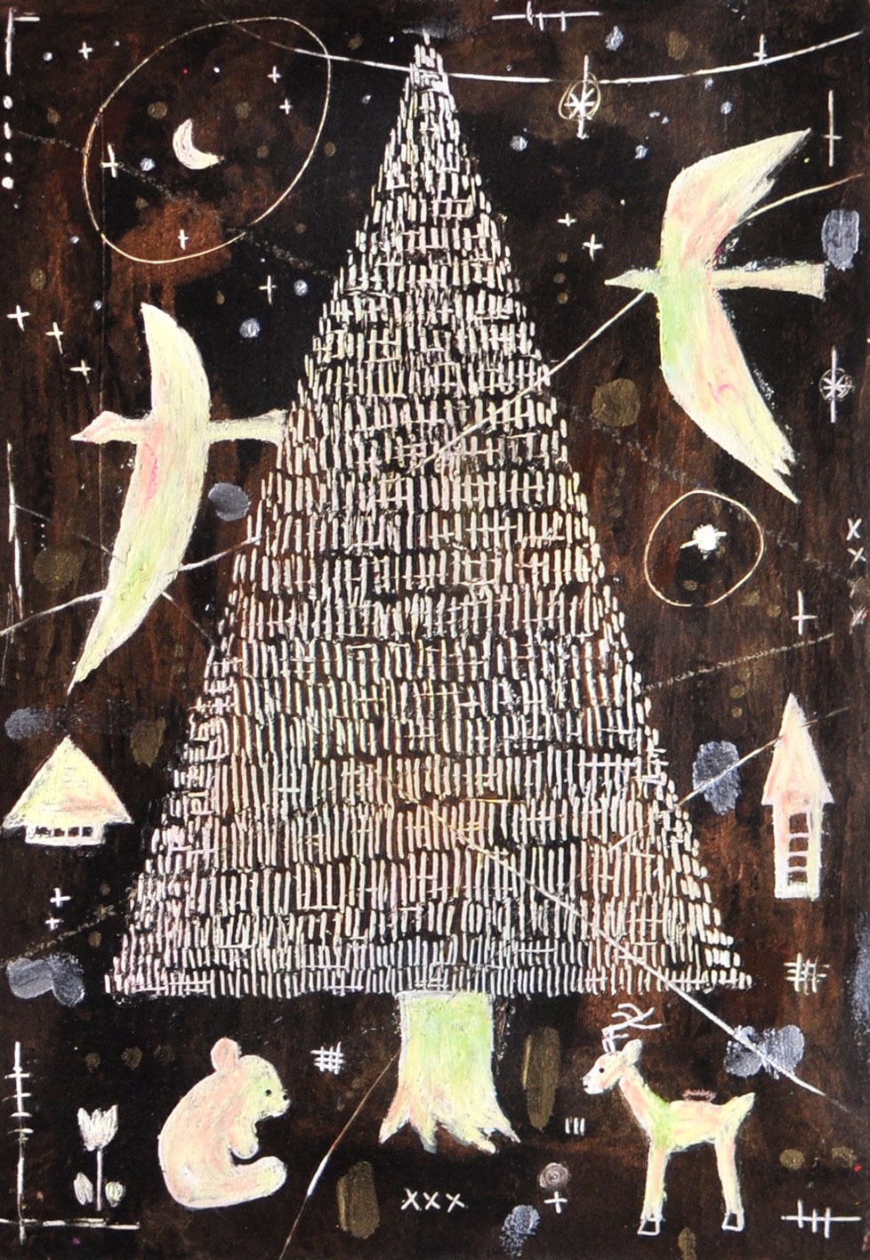 使用画材:木製パネル、アクリルガッシュ、クレパス